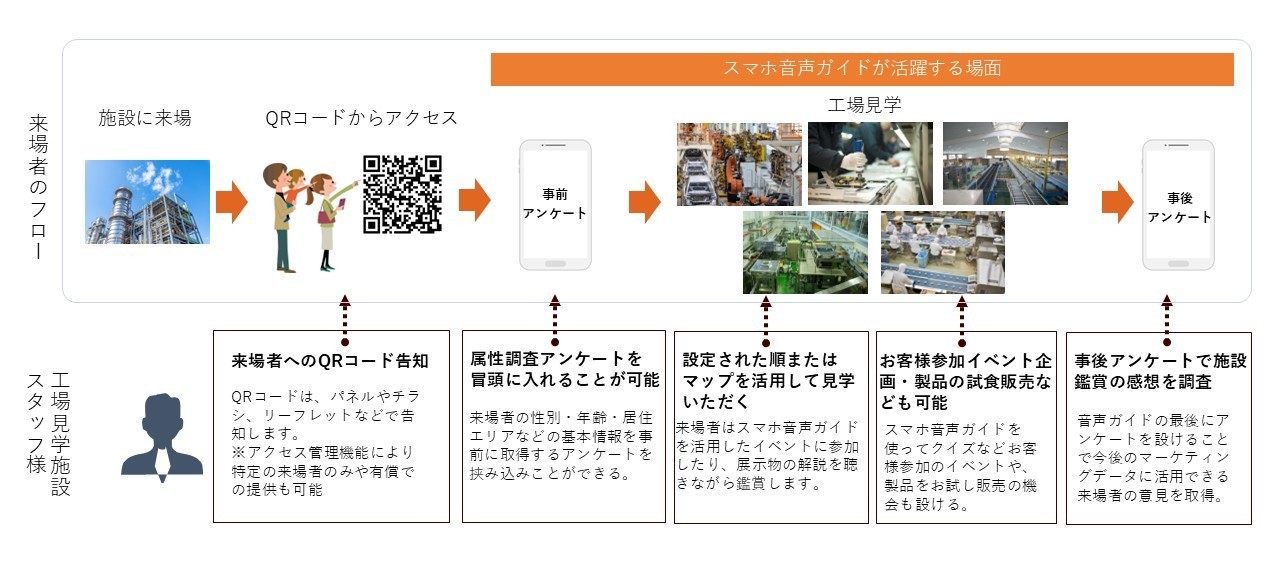 工場見学用スマホ音声ガイドの活用イメージ